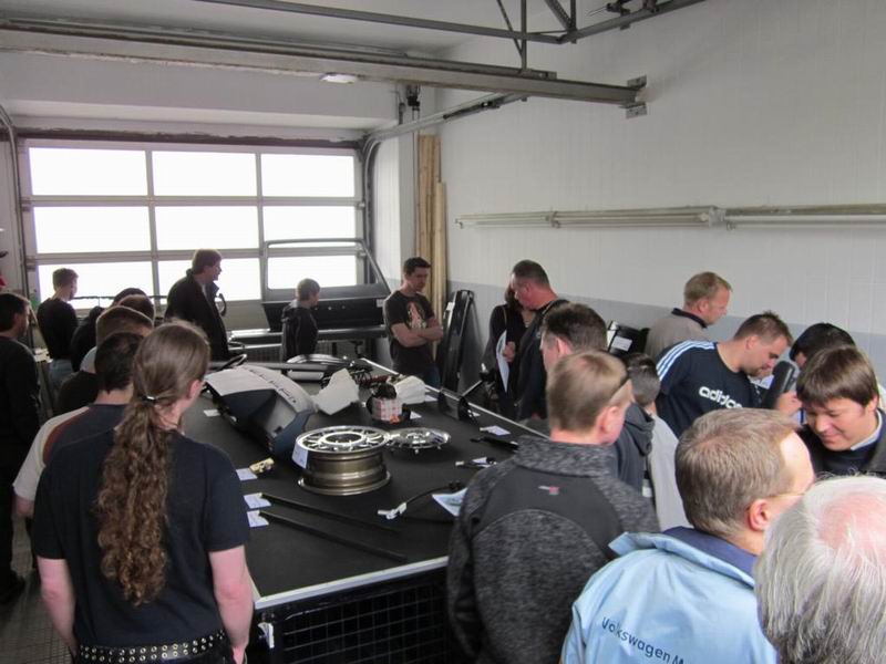 | Die Pilgerfahrt wurde durch das mehrfache Umrunden eines schwarzen Kubus durch die Angehörigen abgerundet... - ein Tanz um die goldene Felge (in der Mitte) und diverse weitere Raritäten. Nach Mitnehma einer Liste mit den verfügbaren Teilen ging es weiter, quer durch Wolfsburg zur nächsten Station. |