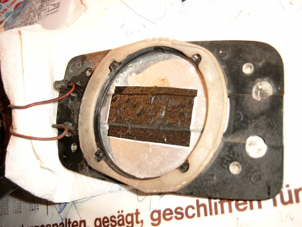| Zur Demontage des Spiegelglases wird durch eines der mittleren Löcher auf der Unterseite des Spiegels ein Schraubendreher eingeschoben und der helle Klemmring gdreht, so daß das Glas aus der Halterung rutscht. Dann hängt das Glas noch an den Drähten für die Beheizung - die Anschlüsse der Heizplatte korrodieren auch gerne weg und lassen sich mit Hausmitteln nicht reparieren. | ||||||||||