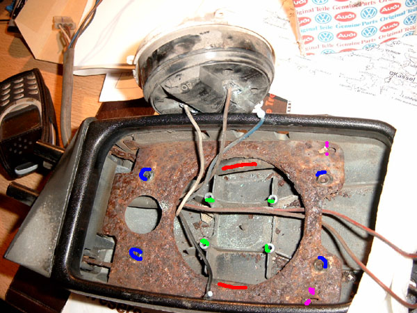 Nach Entfernen der vier Schrauben (grün) der Motorhalterung läßt sich diese Abnehmen (oben); häufig ist hier eines der Kabel abgerostet (hier das Schwarze) - der häufigste Defekt bei Nichtfunktion eines e-Spiegels. Zum Tausch der Federn und des Metallrahmens die vier Kunstoffnieten (blau) vorsichtig ausbohren und den Spiegelrahmen aus der Plastikhülle herausziehen (VORSICHT Federn!) - die in den Hüllrohren (rot) steckenden Federn sind in den Rahmen eingehängt (violett). |