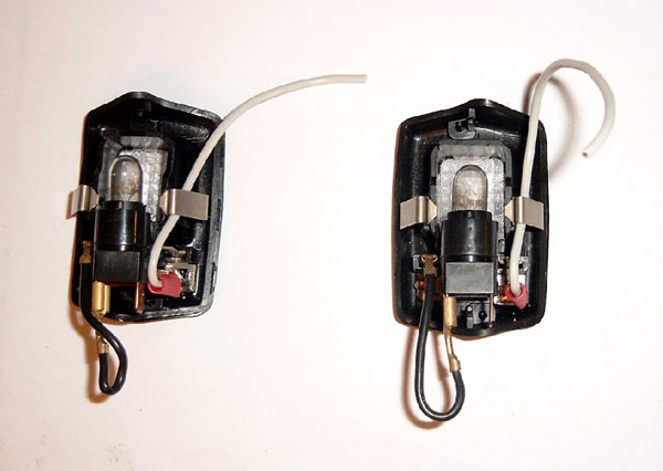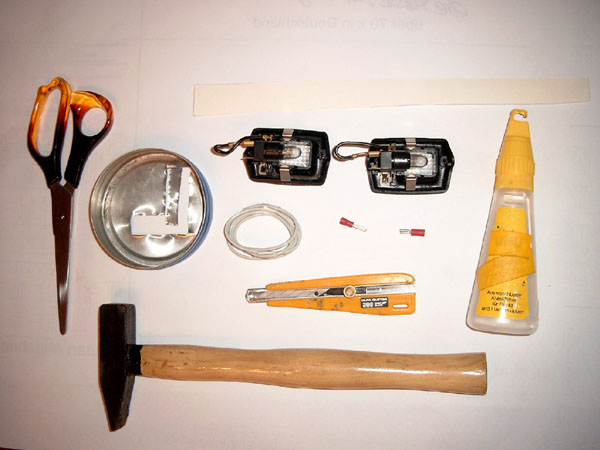 | benötigt werden für die SZBS-Lösung neben zwei Leseleuchten (und bei Nachrüstung in ein CX/CL/LX-Modell dem Kabelstrang) zwei Stecker (3mm), ein dünner Pappstreifen, eine alte Niveadose o.ä. (aus Weißblech!), Hammer. Cuttermesser, Klebstoff, eine Schere... | |||||||||