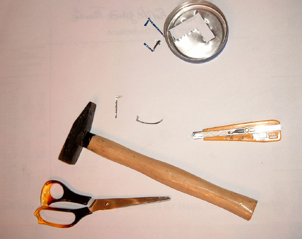 Aus dem Boden der Blechdose werden zwei kleine Metallecken herausgeschnitten, deren Breite etwa der Kontaktbahn in den Leseleuchten entspricht und deren eine Winkellänge auch der Seitenlänge der Kontaktbahn in der Leuchte entpricht. | ||||||||