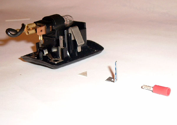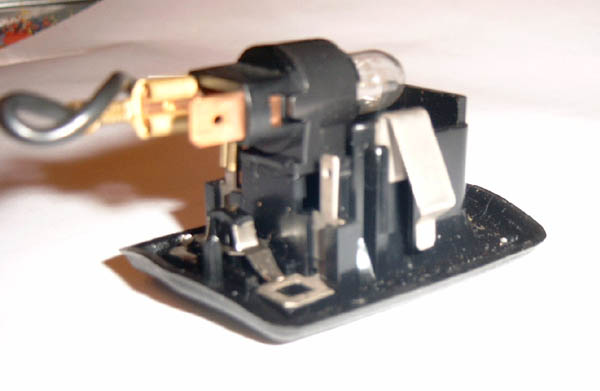 Die Leseleuchte in Nahaufnahme. Gut zu sehen der Kontaktschieber, der hier auf dem quadratischen Ringkontakt ruht ("ein"). Auf der Mittelposition des Quadrates ist das Licht "aus". Die hier sichtbare Position des Schalters wird für die "Innenleuchten / Türkontakt"-Stellung umgenutzt. | ||||||||