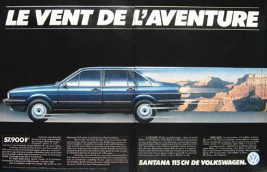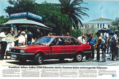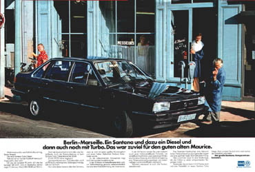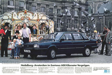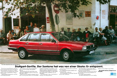 | Umso interessanter wirken einige Werbekampagnen im Ausland: Nicht nur die sehr spezielle und auf den dortigen Markt und den Santana als neues "Carro Nacional" zugeschnittene Werbung in Brasilien, sondern auch Werbekampagnen im europäischen Ausland sprachen eine andere Sprache als in Deutschland... Ungeniert werden hier Fahr- und Motorleistungen hervorgehoben und der Wagen nicht nur als Reiselimousine, sondern auch als Statussymbol in Szene gesetzt. |