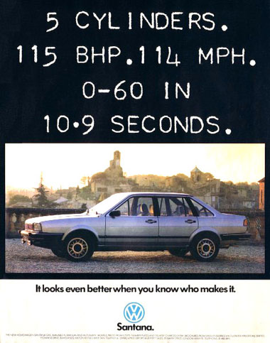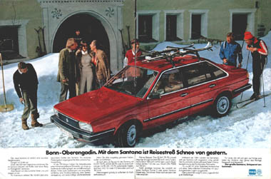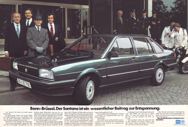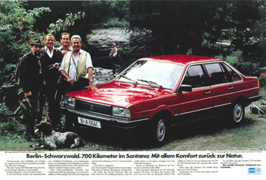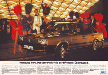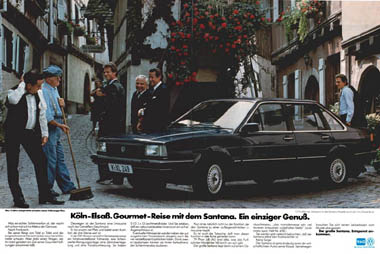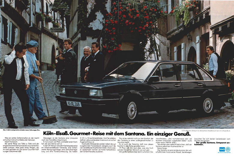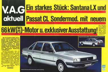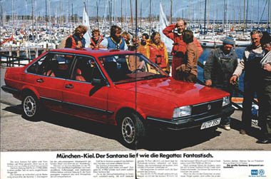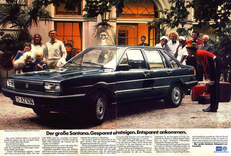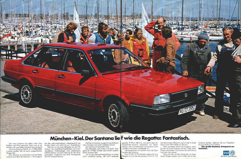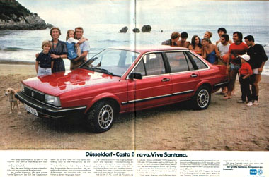 | Mit der Markteinführung des VW Santana ab Januar 1982 wurde eine Reihe von doppelseitigen Anzeigen in überregionalen Autozeitungen geschaltet, z.B. in "Auto, Motor und Sport", der "auto zeitung", aber auch in nicht-fachbezogenen Magazinen wie "Stern" oder "Spiegel".