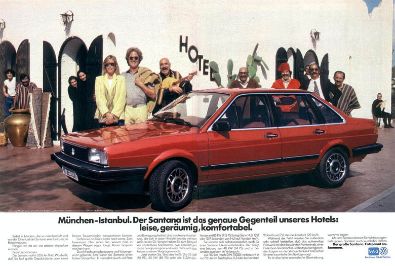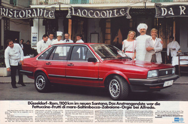Man wird bei diesem Foto vielleicht an Familie Griswold, "Die schrillen Vier auf Achse", erinnert, auch wenn der Santana natürlich nicht im Mindesten dem im Film verwendeten "Family Truckster" entspricht. Bei dem blondbelockten Kellner rechts im Bild könnte man spontan an Pierre Richard in "Der große Blonde mit dem schwarzen Schuh" denken, auch wenn die Schuhe des Kellners hinter dem Wagen verdeckt sind... - Eine Anzeige, die die "deutsche Familie" anspricht und auf den Santana als Auto für den hier durchaus gediegenen Urlaub hinweist. |