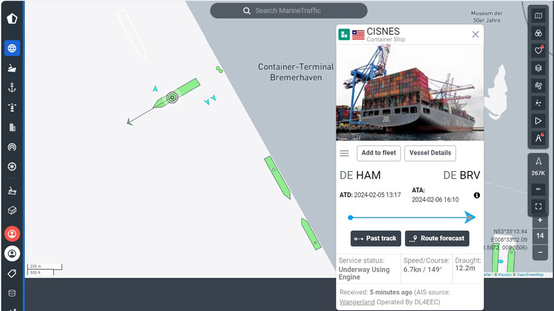 | Am Ende wurde alles gut: Anlegen in Bremerhaven am 6.2.2024 nachmittags. Ohne Kamera. Auf marinetraffic.com war es wieder sichtbar - die Cisnes wurde mit Schlepperhilfe nach Steuerbord gedreht und an die Pier manövriert. | |||||||||||