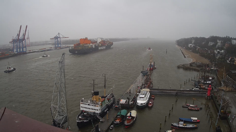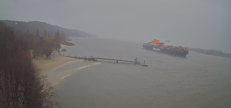 | Später am Tag hatte es aufgeklart - ein Blick auf die bei Altona wieder elbabwärts laufende Cisnes: Die Schlepper bleiben zurück. | |||||||||||