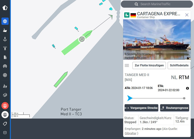 | Wenn keine Kamera verfügbar ist, muss das Schiffs-Tracking-Tool, wie hier Marinetraffic.com, ausreichen - hier im Hafen von Tanger, die Cartagena Express wird von zwei Schleppern an die Pier bugsiert. | |||||||||||